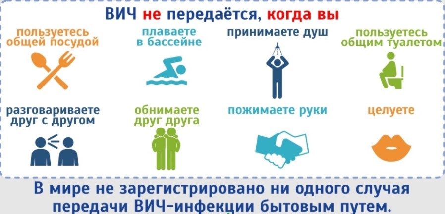 в совместных водных процедурах (например, в душе или бассейне). ВИЧ не передаётся во время объятий, поцелуев, рукопожатий. Невозможно заразиться через укусы комаров и других кровососущих насекомых,