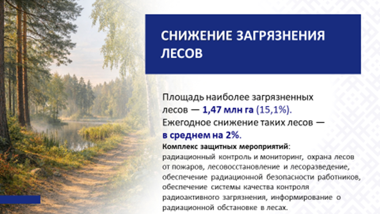 Ежегодно проводится радиационное обследование лесных массивов, наиболее посещаемых людьми, в целях определения мест, где сбор березового сока, дикорастущей продукции (ягод и грибов) запрещен. Наблюдается медленное уменьшение площади радиоактивного загрязнения цезием-137 лесных экосистем (в среднем на 2% в год).